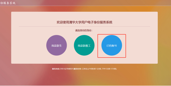 1. 请您访问https://id.tsinghua.edu.cn,点击“已有帐号”。输入证件号/账号和密码登录。