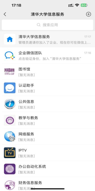 5. 成功关注后,“清华大学信息服务”企业号中将显示更多功能,如下图所示: