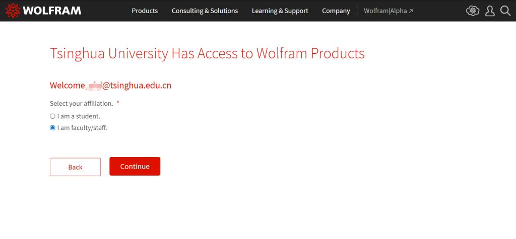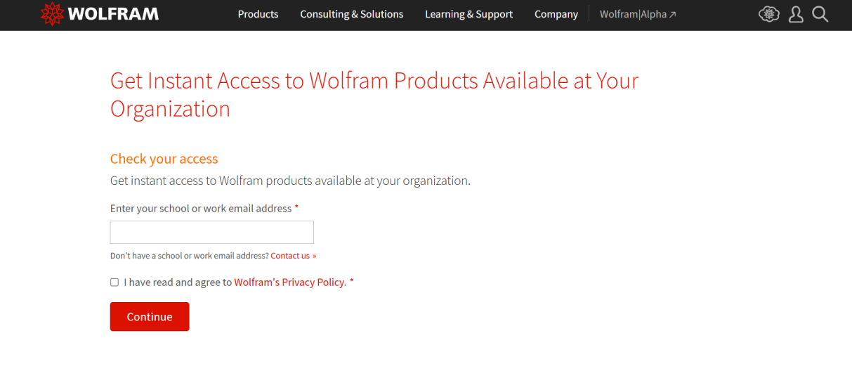 a.Visit https://www.wolfram.com/siteinfo/index.php.en?source=footer, enter the university email address you just registered with, check the box, and click "Continue."